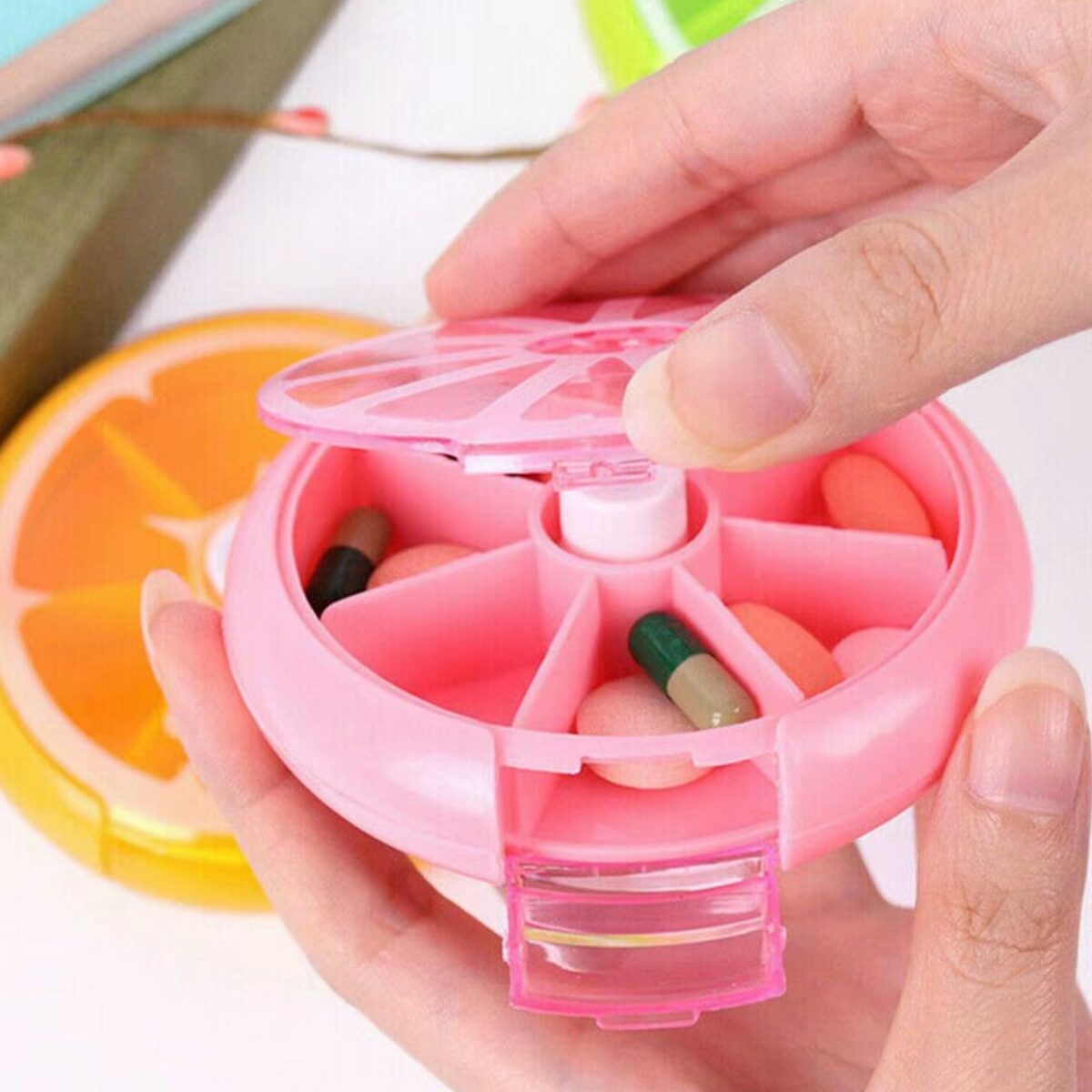 Pilulier rond à 7 cellules : Ce pilulier rond à 7 compartiments peut classer et stocker différents types de comprimés, ce qui est pratique pour distinguer et trouver les pilules. La division indépendante aide à maintenir les propriétés des comprimés pendant longtemps sans affecter l’efficacité des uns et des autres.